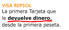 Pagar� menos por sus compras, porque la tarjeta Visa Repsol le devuelve dinero desde la primera peseta. Con ella, usted conseguir� el 1% de descuento en sus compras de m�s de 15 millones de establecimientos, ya sea en Espa�a o en el extranjero.